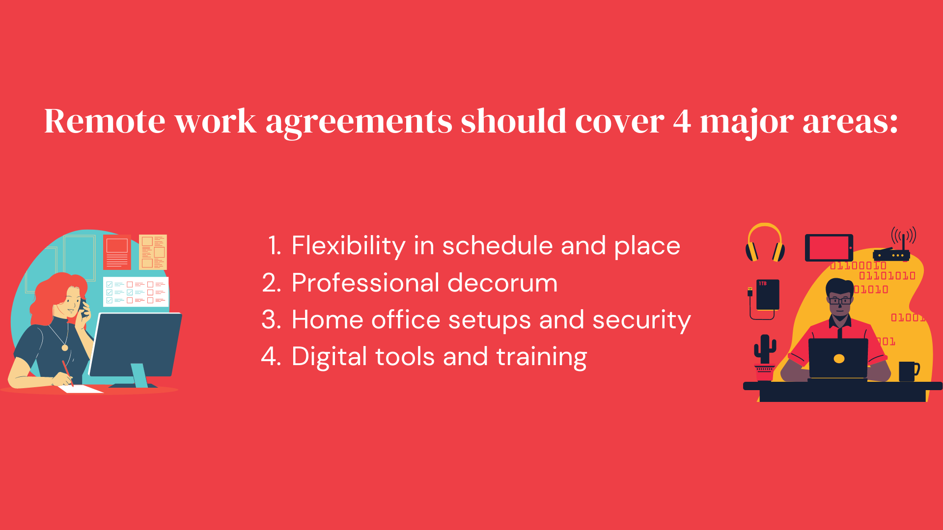 So leaders volition need to develop remote work agreements covering 4 major areas: